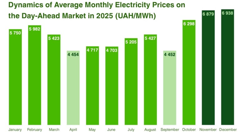At the same time, the market demonstrates high seasonal and short-term volatility: the weighted average price of the RDN is UAH 5,643.94/MWh with a maximum at the end of the year (up to UAH 8,220.83/MWh) and a minimum in May (~ UAH 2,446/MWh); on the VDR, the amplitude is even wider - from ~2,183 UAH/MWh to peak ~10,804 UAH/MWh. Such dynamics indicate that even with an overall market surplus, short-term deficits during peak hours can create significant price shocks and increase operational risks for suppliers and consumers.